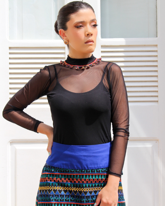 A Blusa Segunda Pele é a peça Tumemup. A modelagem dela é feita com as próprias medidas do corpo, sem muito acréscimo, para que ela fique certa, uma segunda pele, como o próprio nome diz. Com variações de cores, aviamentos e detalhes, sempre teremos essa peça, que funciona no papel principal da produção, como também nas sobreposições.